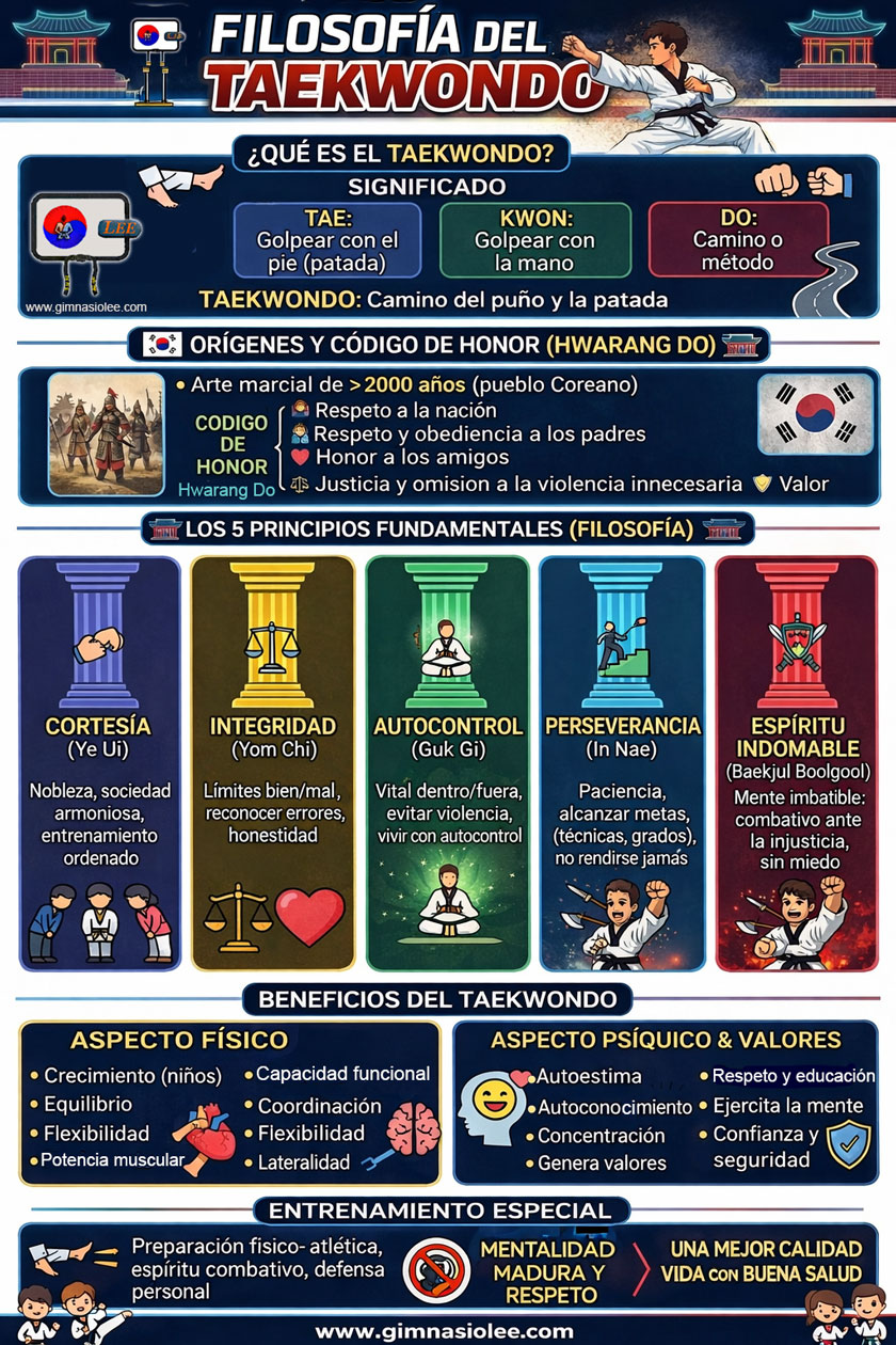 La filosofía del Taekwondo se basa en cinco principios: Cortesía, Integridad, Perseverancia, Autocontrol y Espíritu Indomable.