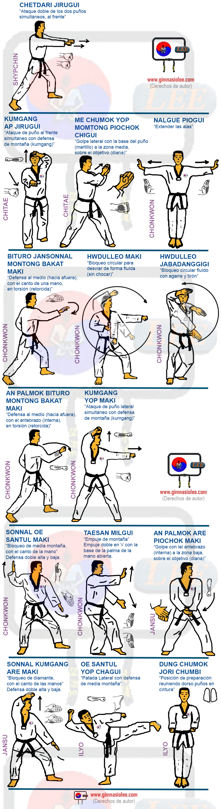 - "Dangkio": agarrar, atraer, tirar hacia uno mismo. - "Ollyo": ascendente.- "Murup": rodilla. - "Chigui": golpear (de forma indirecta o circular).