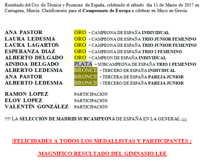 CTO. ESPAÑA POOMSAES 2017 Infantil, Adulto y Freestyle Cartagena (Murcia) Resultados Gimnasio Lee: » Ver Galería de Fotos