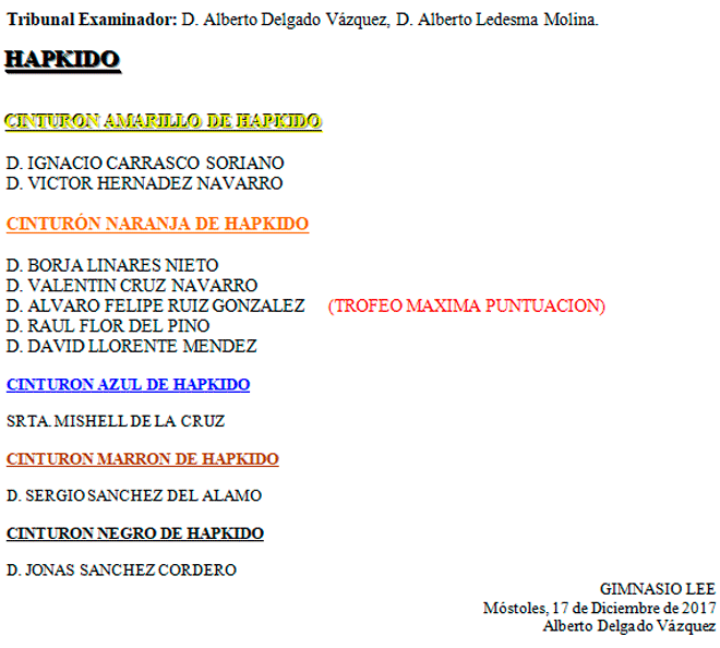 EXAMEN TAEKWONDO Y HAPKIDO Gimnasio Lee 18 dic 2017 RESULTADOS TAEKWONDO RESULTADOS HAPKIDO » Ampliar fotos