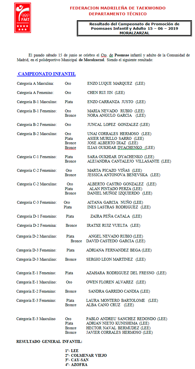 PROMOCIÓN MADRID POOMSAES junio-2019 Infantil y Adultos Moralzarzal (Madrid) » Ver Galería de Fotos ¡ Felicidades ! a todos