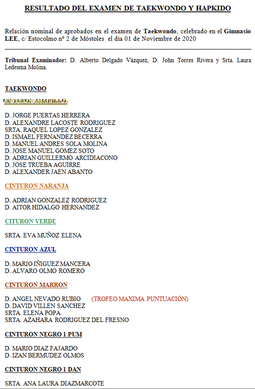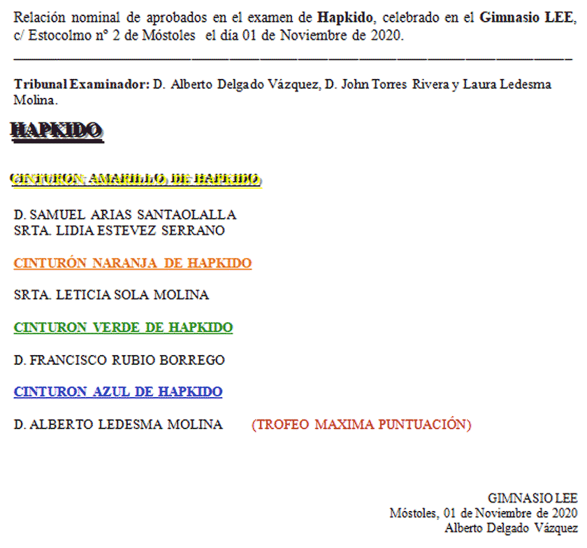 EXAMEN TAEKWONDO Y HAPKIDO Gimnasio Lee 01 noviembre 2020 RESULTADOS TAEKWONDO RESULTADOS HAPKIDO » Ver Galería de fotos: