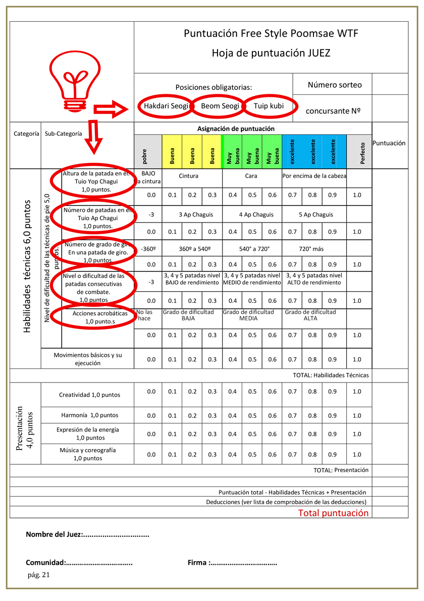 - Poomsae y la conexión entre los ataques y las defensas están en perfecta armonía se evaluarán en el rendimiento general del Poomsae de estilo libre.
